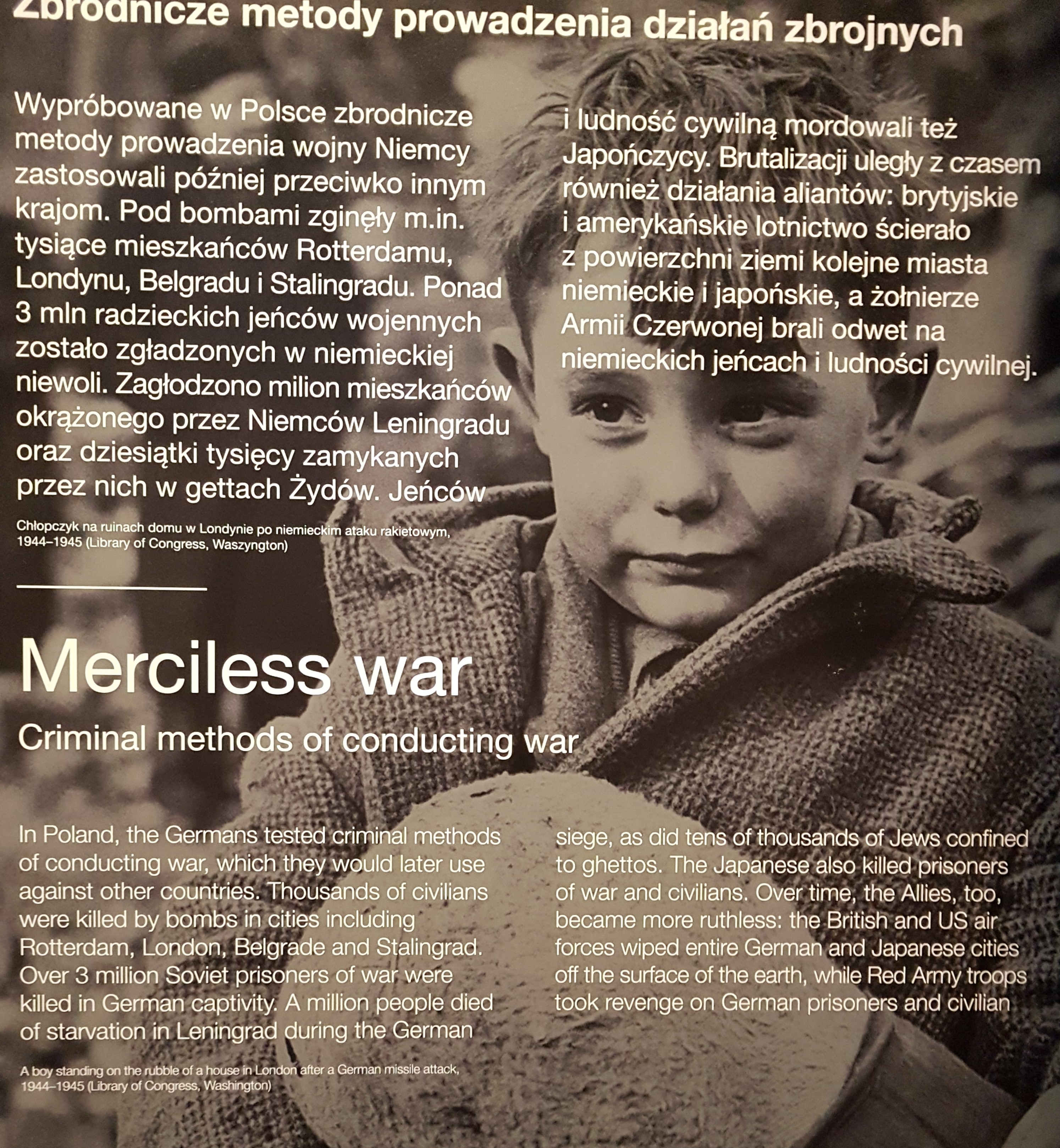 Perang tanpa belas kasihan – Di Polandia, Jerman ngetes berbagai metode kriminal untuk perang. Abis itu metode kriminalnya diaplikasiin juga ke negara-negara lain. Sianjing. Akibatnya ribuan warga sipil terbunuh karena bom, di antaranya Rotterdam (makanya di kota ini banyak bangunan “baru” ketimbang kota-kita lain di Belanda, karena Rotterdam waktu abis dibom hampir abis, jadi kotanya dibangun lagi dari tahun 1950an-1970an), London, Belgrade (ibukota Serbia), dan Stalingrad (di Rusia). Jutaan orang mati kelaparan di Leningrad (Rusia) waktu Jerman ngepung, termasuk puluhan ribu orang Yahudi yang dikurung di daerah kumuh, juga ikut mati. Tentara Jepang juga ngebunuh tahanan perang dan warga sipil. Gitu aja terus bales-balesan antara Sekutu (the Allies) sama Axis, tanpa mandang nyawa dan hajat kehidupan orang banyak sama sekali.