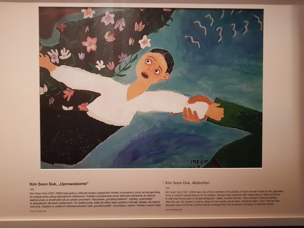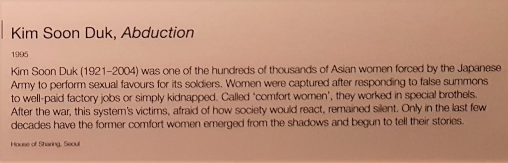Ini adalah lukisan penculikan Kim Soon Duk, satu dari sekian perempuan Asia yang dipaksa untuk “melayani” tentara-tentara Jepang. Perempuan-perempuan ini ditangkep dengan cara ditipu, dibilangnya akan ada kerjaan di pabrik dan bayarannya bagus. Kalo nggak ditipu dengan cara begitu, biasanya mereka malah langsung diculik. Mereka dipekerjakan di rumah bordil dan biasa disebut dengan panggilan “comfort women.” Setelah perang kelar, korban-korban ini takut sama perlakuan dan stigma masyarakat kalau mereka tau apa yang menimpa mereka, jadinya mereka diem aja. *nangis* Baru beberapa dekade belakangan mereka mulai berani bicara dan nyeritain kisah pahit mereka. Lagi-lagi gue doain semoga di kehidupan selanjutnya, mereka dikasih kebahagiaan lahir batin.
