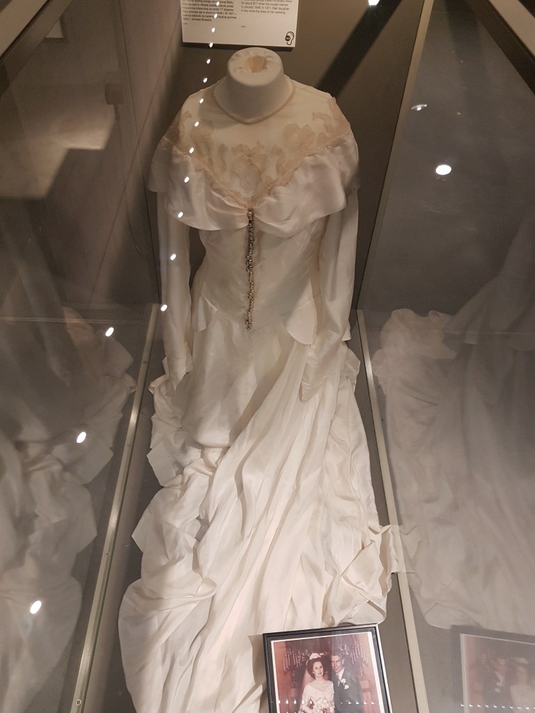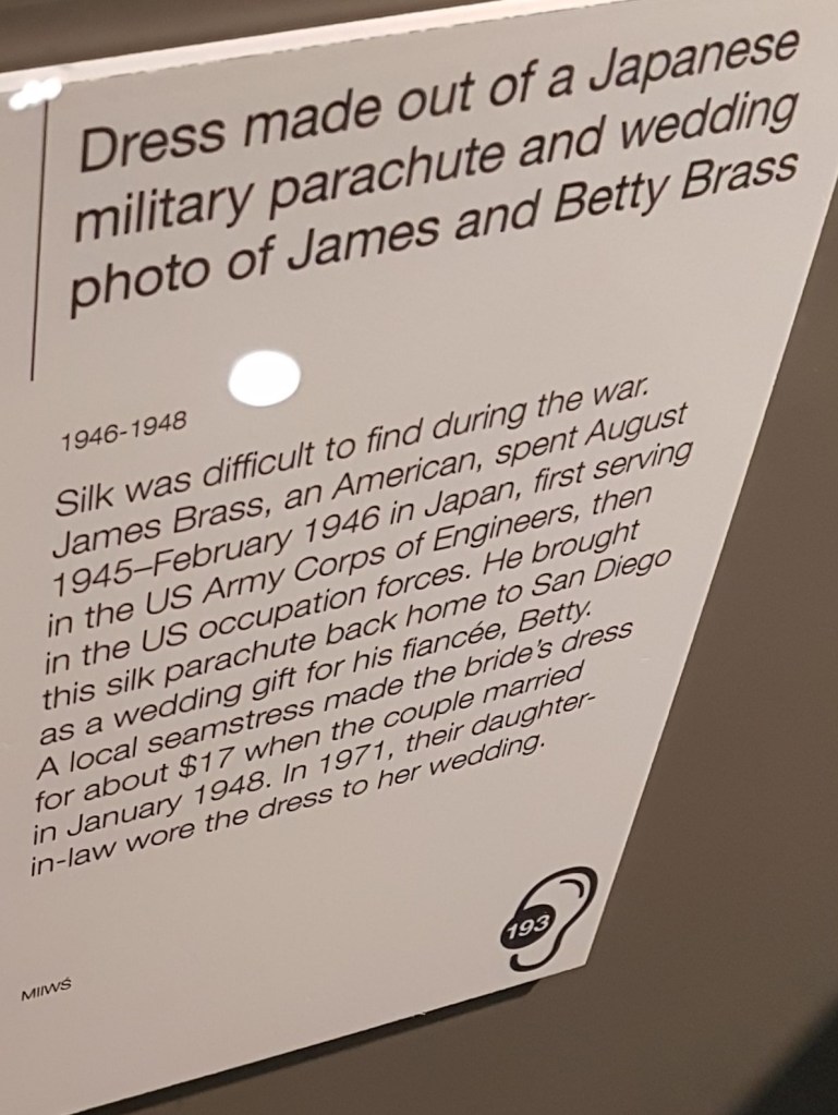 Terus ada gaun pernikahan yang terbuat dari… parasut militer. Saking susahnya dapet kain sutra, jadinya pake parasut..