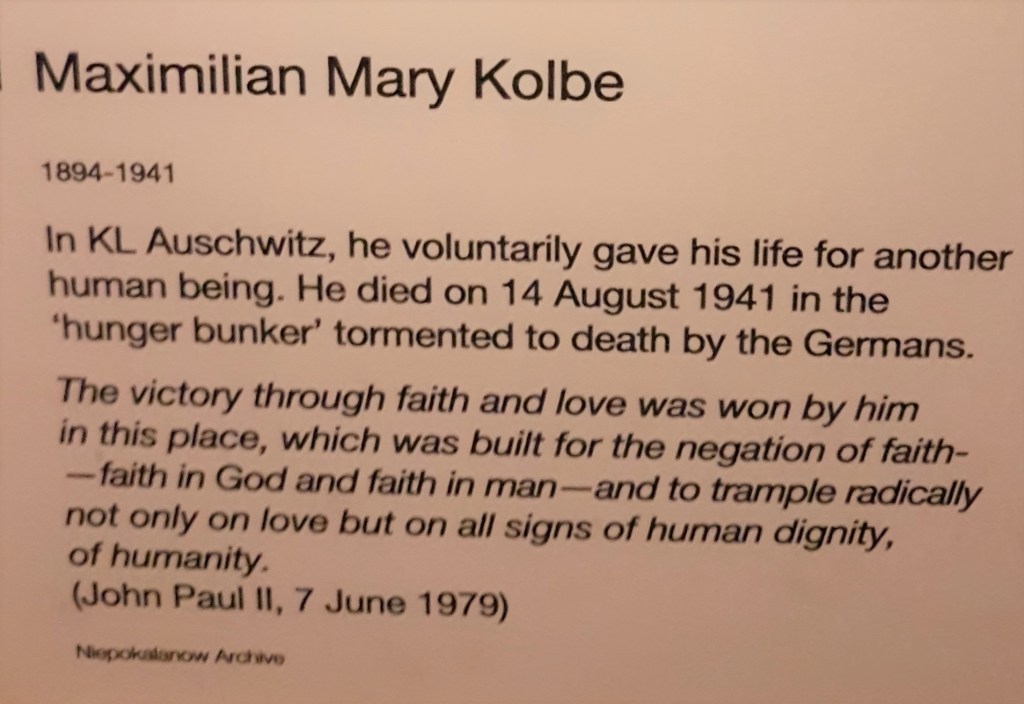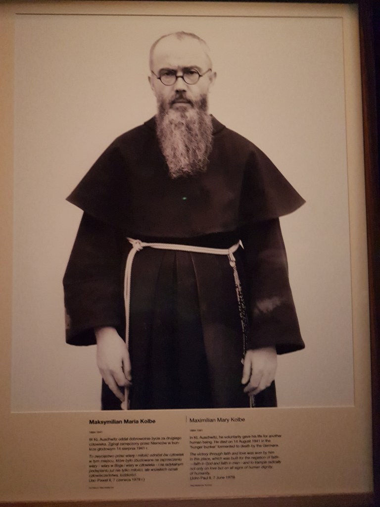 Pastor di bawah ini namanya Maximilian Mary Kolbe. Dia jadi martir di kamp Auschwitz, merelakan dirinya untuk dikurung dan mati pelan-pelan di hunger bunker, nggak dikasih makan dan minum. Setelah dua minggu dan napi-napi yang lain udah pada meninggal, Kolbe masih tetep idup. Karena bunkernya mau dikosongin, akhirnya penjaga bunker nyuntikin carbolic acid ke badan dia. Carbolic acid itu bahan kimia beracun yang di dalemnya mengandung tar dan biasanya dipake untuk bikin plastik, nilon, atau untuk bunuh kuman. 😦