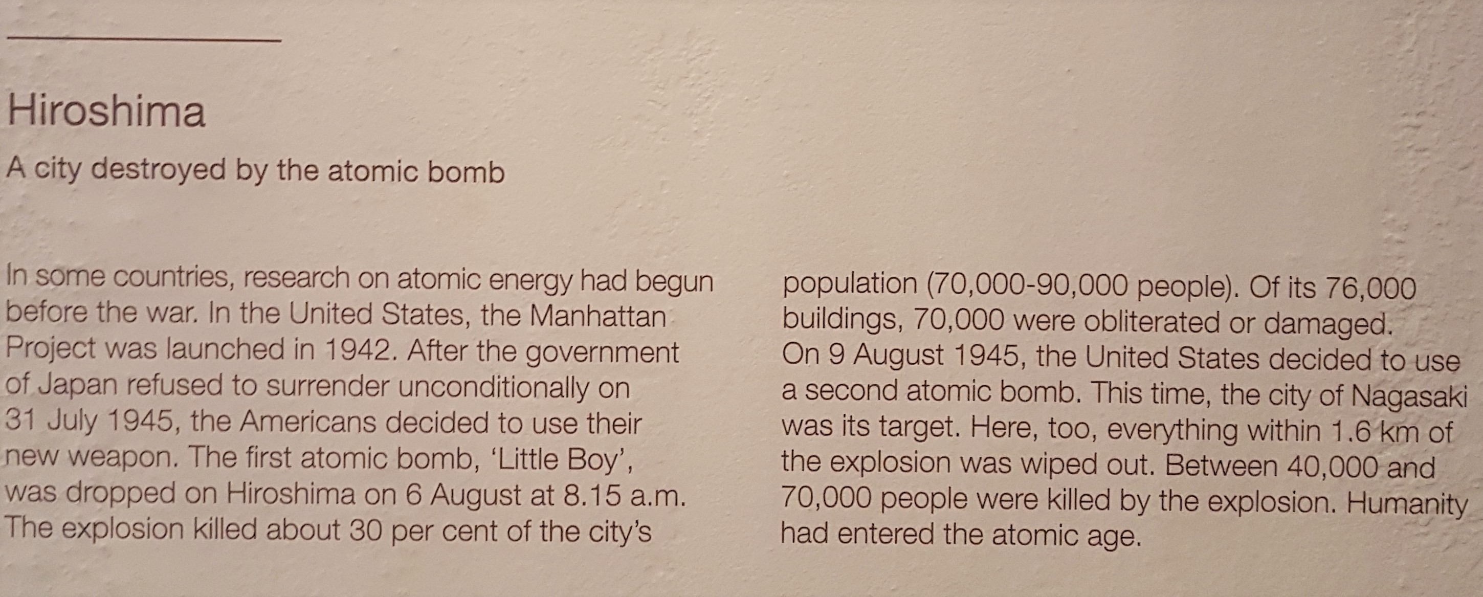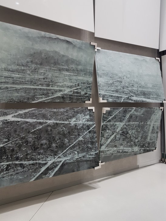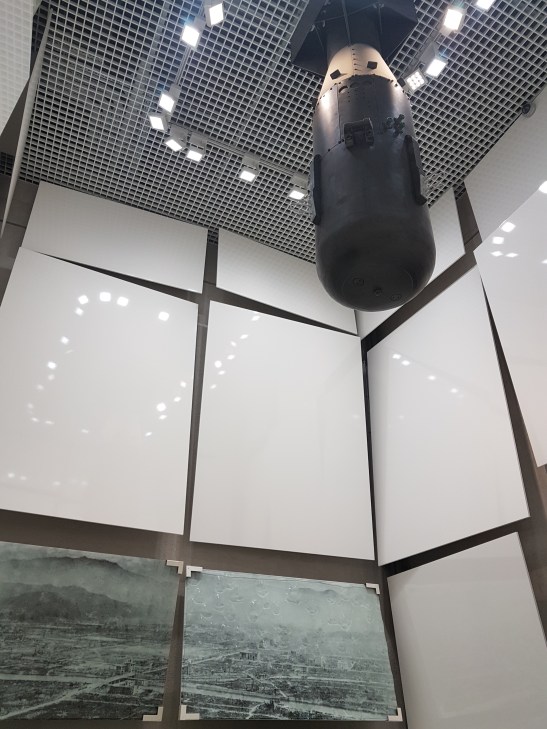 Yang digantung di atas itu replika bomnya. Katanya itu ukuran asli bom atomnya. Terus foto yang satu lagi nunjukin kondisi Hiroshima dan Nagasaki setelah dibom.
