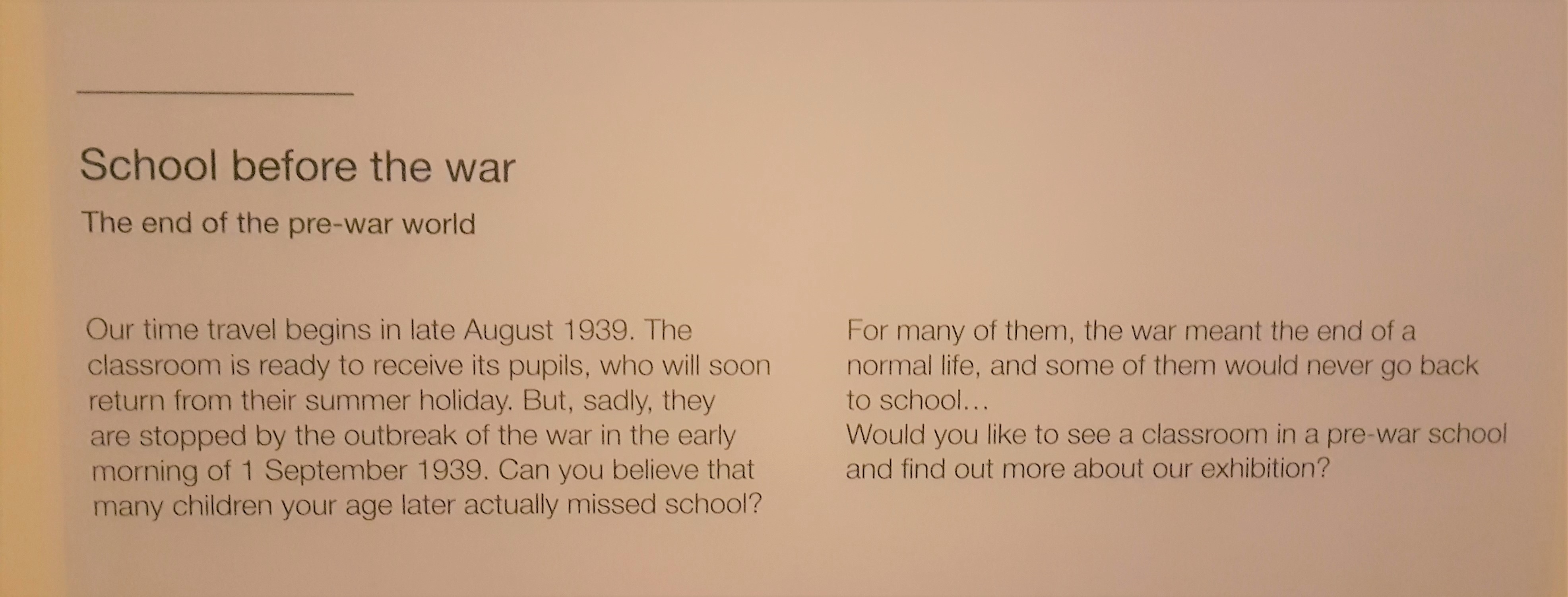 Kita mulai dari sekolah dulu, ya. Ini adalah simulasi kondisi sekolah sebulan sebelum Perang Dunia kedua dimulai. Semuanya baik-baik aja, tapi perang dunia bikin anak-anak nggak bisa sekolah dan bahkan banyak yang nggak nyambung sekolah lagi setelah perangnya selesai. Gue sih nggak kebayang sekolah dalam suasana sehoror dan senggak pasti itu.