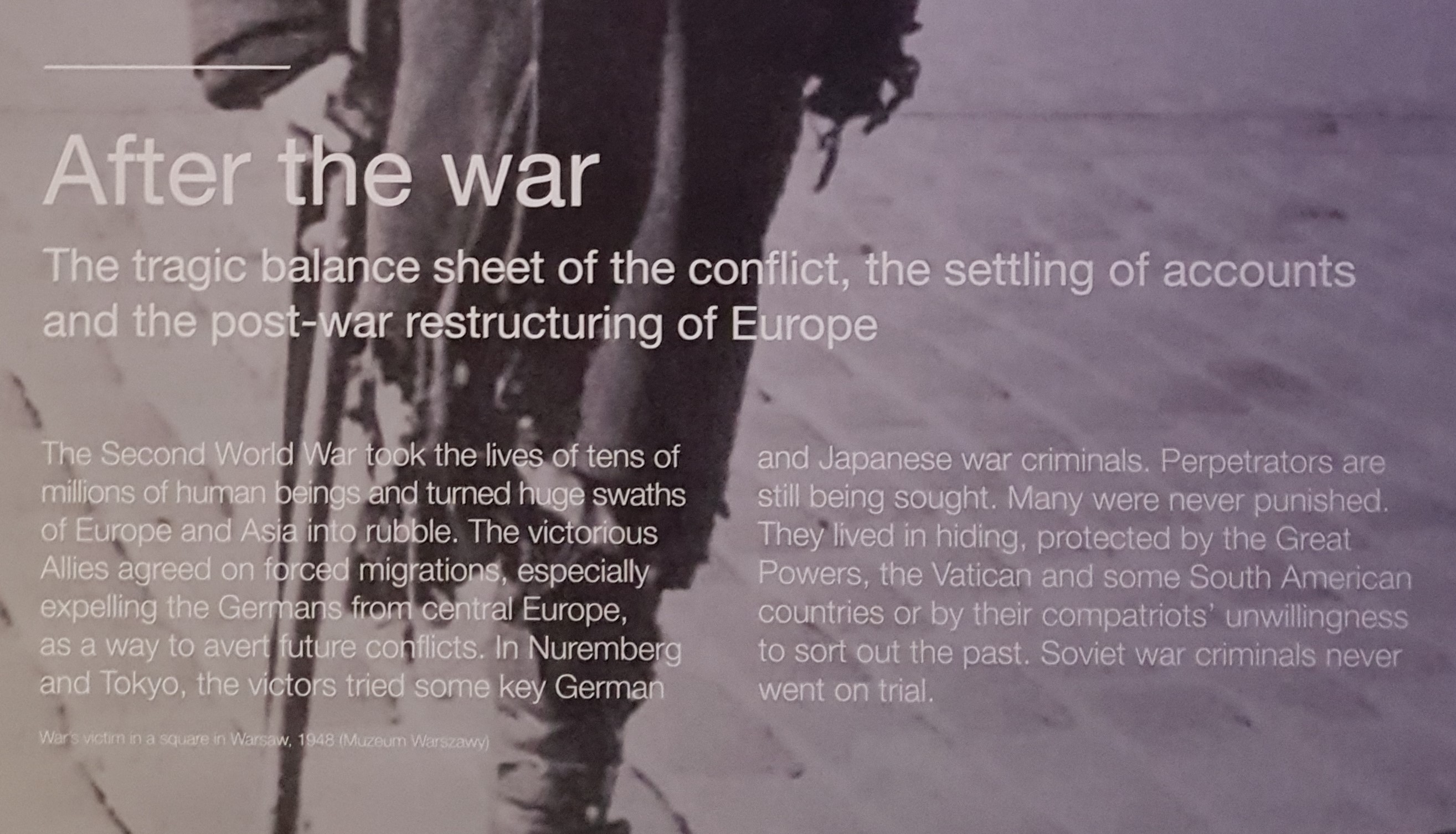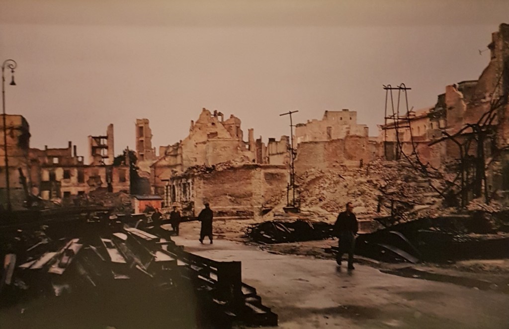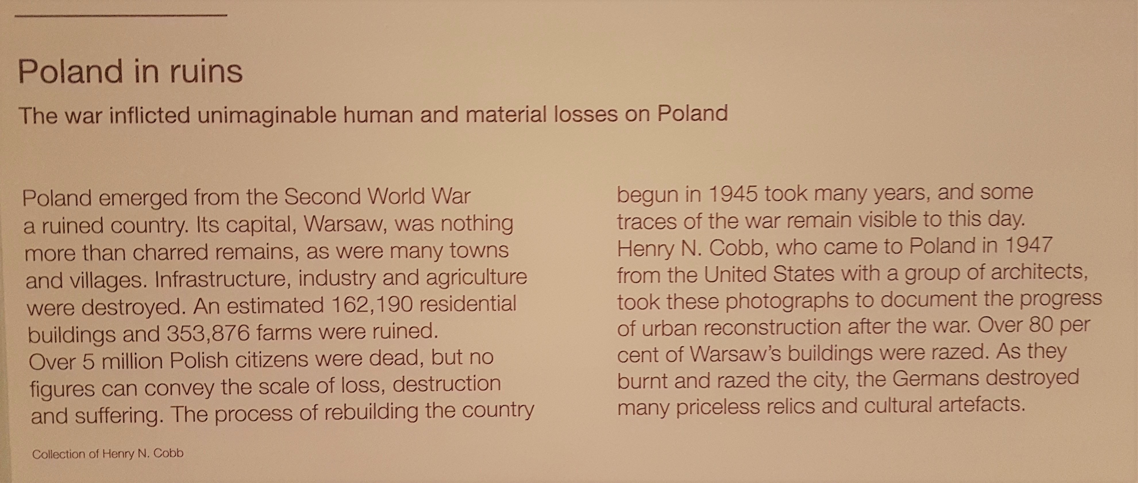 Setelah perang kelar, Polandia, khususnya Warsawa tentu saja hancur lebur, termasuk juga banyak kota dan desa di Polandia. Kira-kira ada 162,190 gedung pemukiman dan 353,876 peternakan yang ancur, dan lebih dari lima juta orang Polandia meninggal. Polandia yang tadinya udah merdeka harus ngebangun lagi negaranya dari tahun 1945 sampe tahun-tahun berikutnya, tapi bahkan bekas-bekas perangnya masih keliatan sampe hari ini. Foto-foto di bawah ini diambil oleh Henry N. Cobb yang dateng dari Amerika Serikat tahun 1947 bareng sekelompok arsitek untuk mendokumentasikan kemajuan rekonstruksi urban Polandia setelah perang. 80% dari gedung-gedung di Warsawa dirubuhin sama Jerman dan banyak banget artefak dan peninggalan budaya yang juga mereka ancurin.