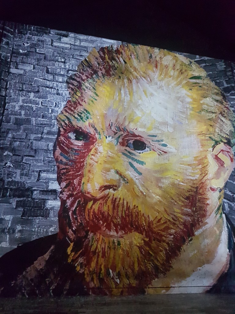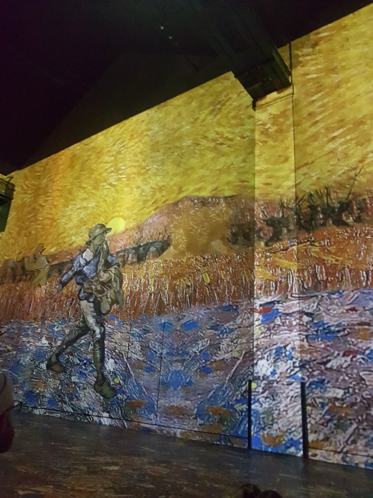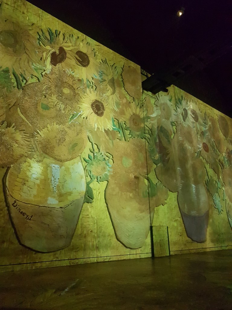 Tiket gue ini berlaku untuk beberapa jam dan pameran immersive art-nya tuh looping gitu. Ada dua proyeksi seniman lain juga, jadi ada waktu cukup untuk foto-foto dan rekam proyeksi lukisan-lukisan Van Gogh dan waktu untuk duduk dan ngelamun ngeliatin semuanya. LOOK AT THESE BEAUTIES! Ini aslinya gambarnya gerak semua, gaes. Jadi kalau ada lukisan air, permukaan airnya seolah goyang. Gue duduk lama sambil dengerin beberapa lagu di Spotify yang cocok sama suasananya (paling bener sih Lianne La Havas yang “Starry Starry Night” yah). It was super magical. *nangis*