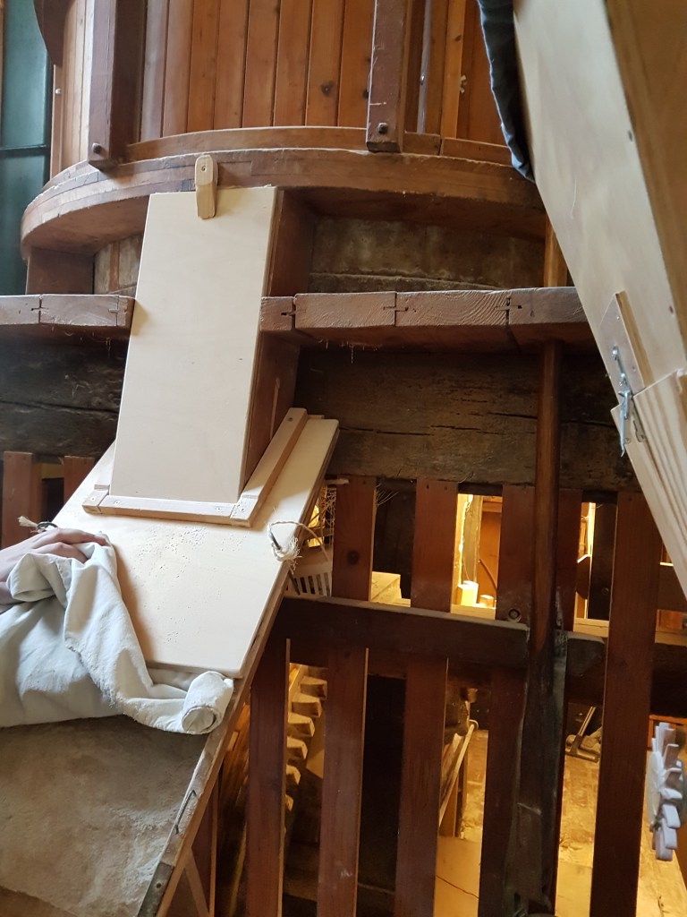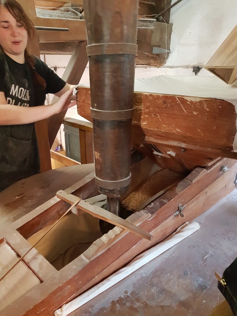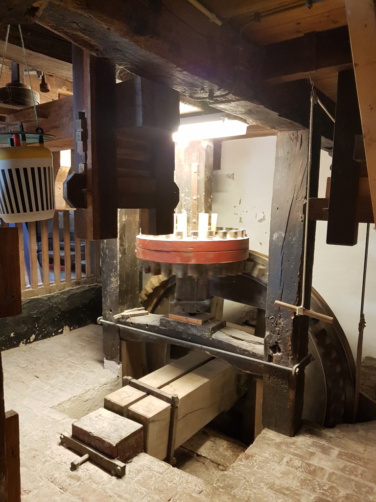 By the way, di atas tadi gue sempet tulis kalo di area ini ada pabrik penggilingan gandum (De Witte Molen – udah pernah direstorasi tahun 1966-1967) yang mesinnya nggak pernah diganti dari zaman dulu. Dari tahun 1470, coooy! Kayak di bawah ini nih bentukannya. Kalo kalian ke sana, mereka bisa jelasin lebih lanjut soal si mesin penggiling toku ini dan nyontohin cara pemakaiannya. Nanti hasil dari penggilingan gandum ini bisa kalian beli dalam bentuk tepung organik atau roti yang dijual di sana.