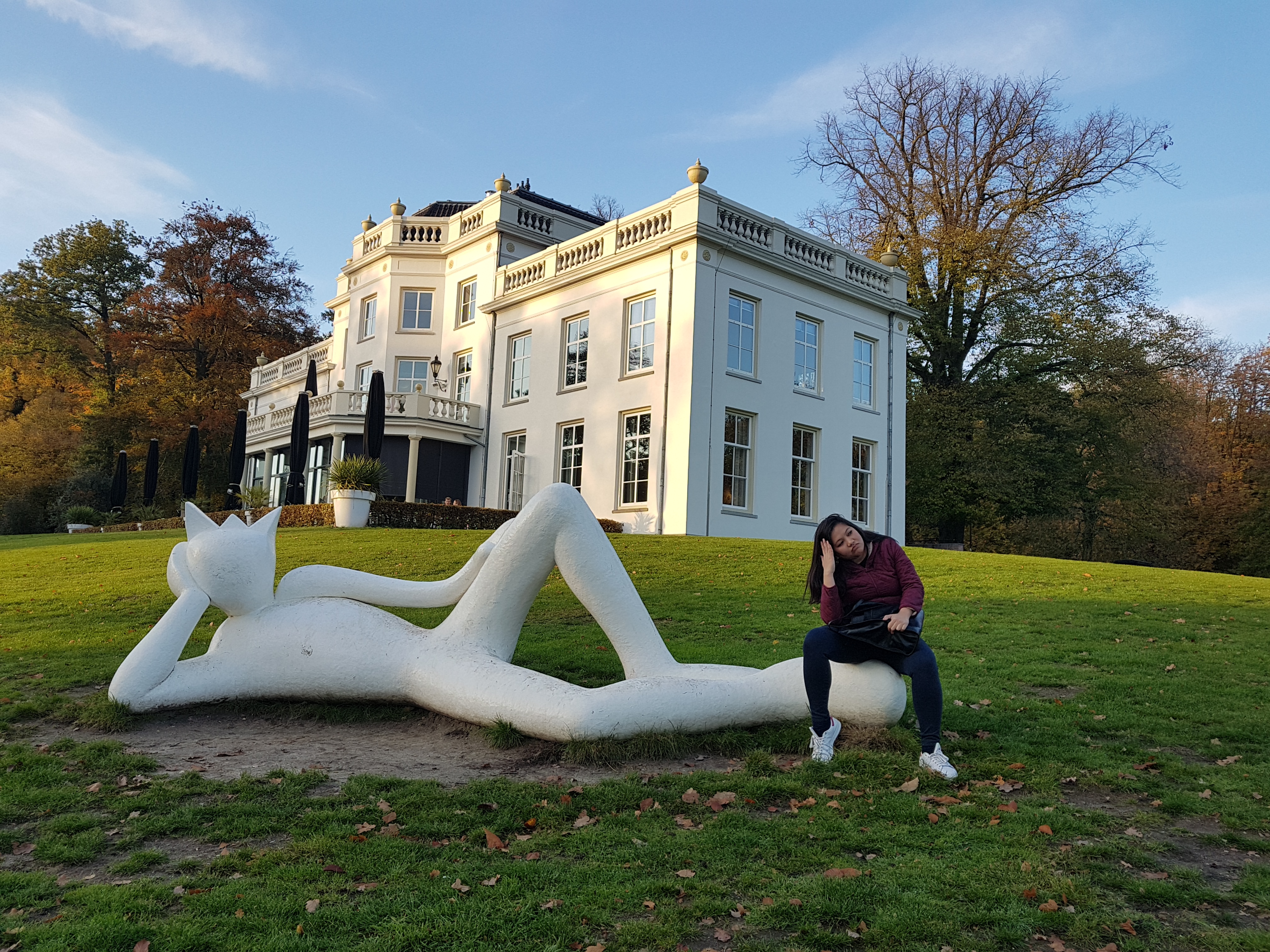 Instalasi seni ini judulnya “The Lazy King” karya seniman visual dari Perancis, namanya Alain Sechas, dibuat tahun 2008. Yang di belakangnya si Stadsvilla itu.