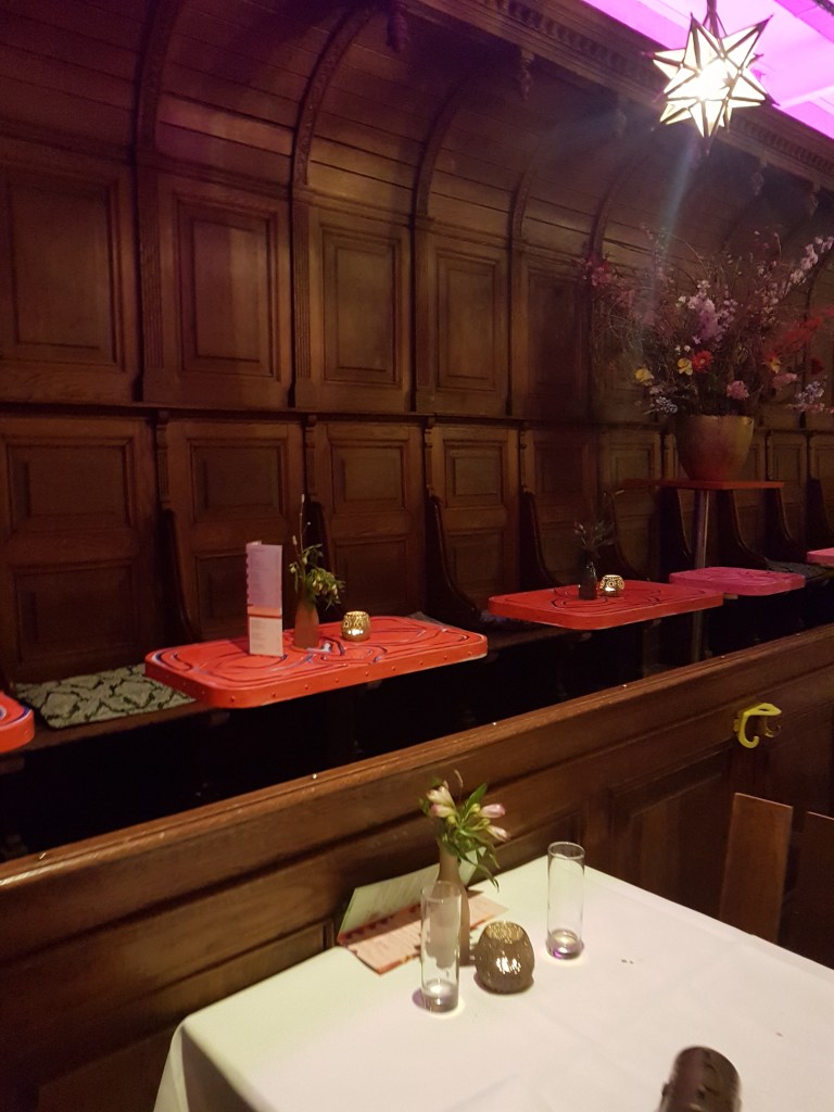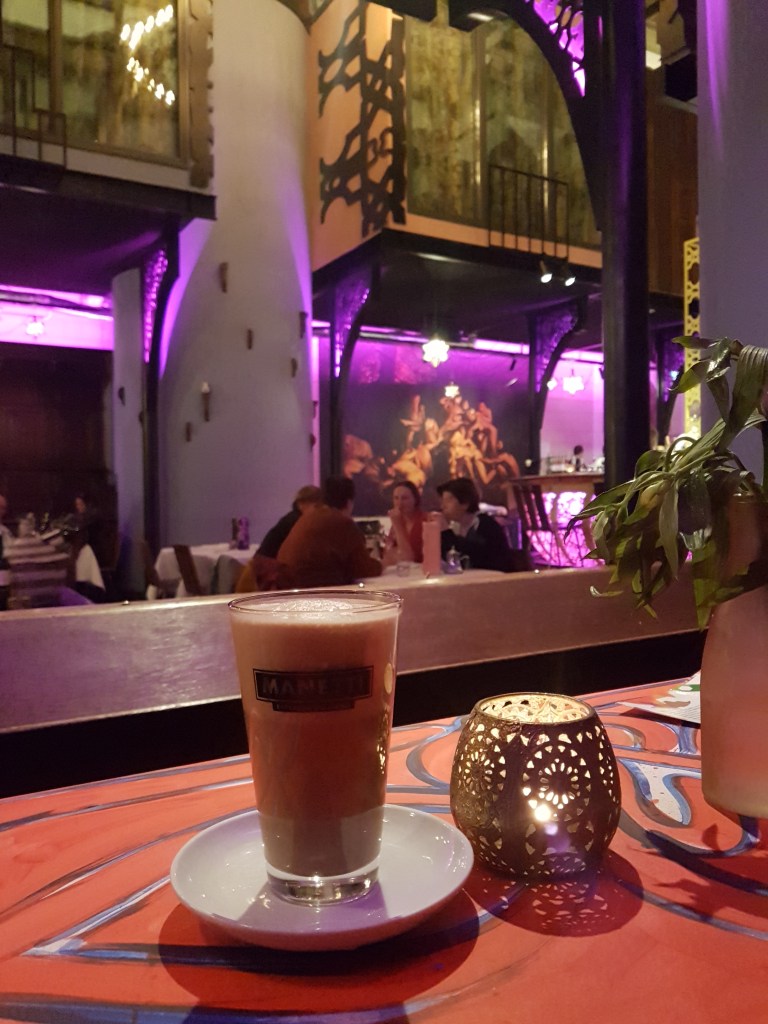 Tempat ini dulunya adalah gereja Lutheran yang kondisinya masih OK banget alias dirawat dengan baik. Pengelolanya semaksimal mungkin nggak ngubah terlalu banyak dan manfaatin interior dan barang-barang yang ada sebagai properti untuk restoran dan barnya. Di sini nyajiin masakan ala Mediterania-Moorish (masakan-masakan yang dipengaruhi Spanyol dan Afrika Utara kayak Maroko). Mereka juga nyebut hotel mereka di sini sebagai “floating hotel”. Kenapa? Tadinya gue juga bingung apa maksudnya. Terus pas gue dongak ke atas… OHHH… Ternyata di sisi kanan kiri langit-langit tuh kayak ada kotak-kotak yang dalemnya kamar. Jadi yang nginep bisa liat-liat ke bawah, liat suasana bar. Gue pikir kan hotelnya ada di mane, taunya mereka manfaatin ruangan semaksimal mungkin dan bikin “hotel panggung” kayak begitu. Nih, lo liat aja foto-foto di bawah. Di foto pertama di atas pilar kanan kirinya ada kayak kotak-kotak melayang, kan?
