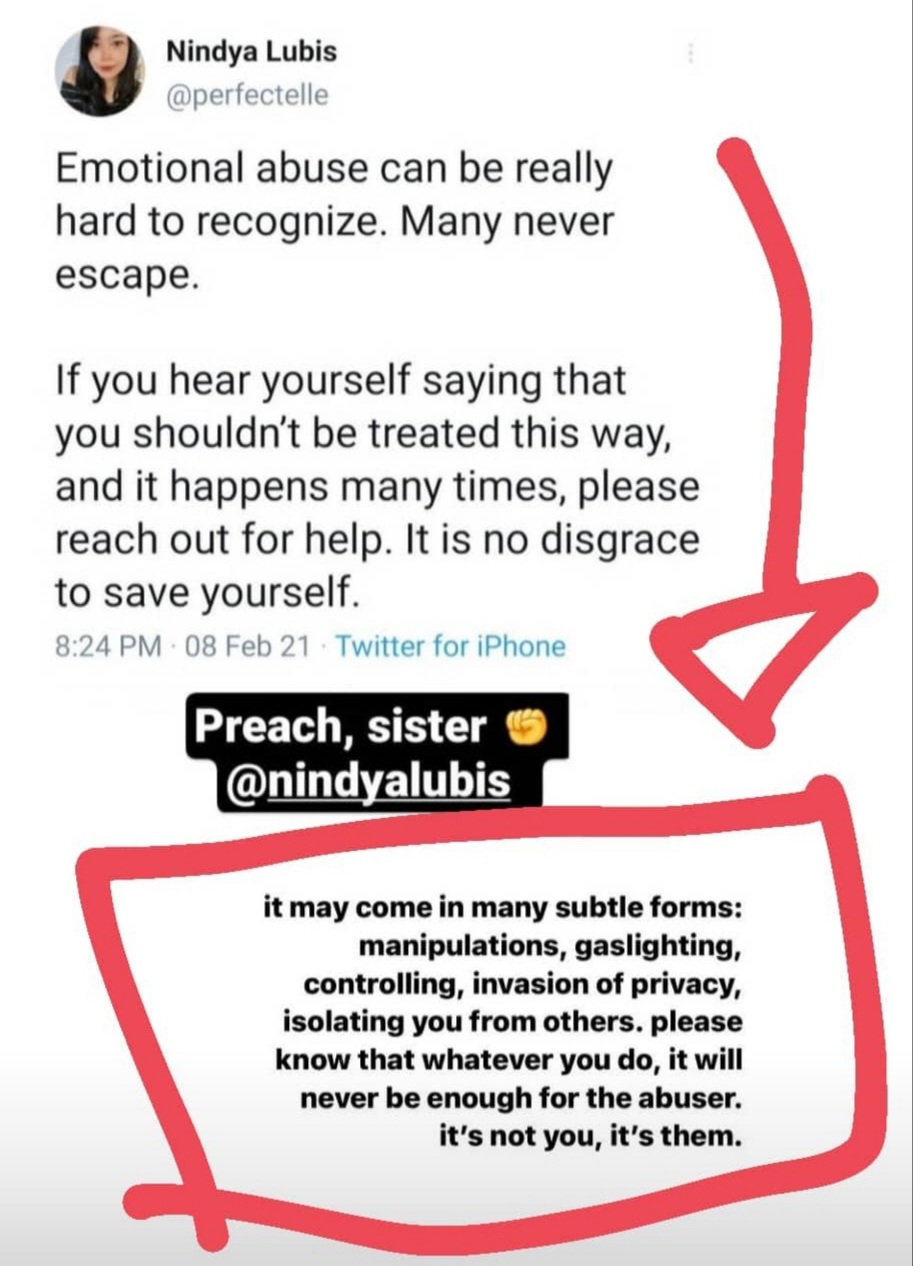 Kata hati sama insting tuh nggak pernah berdusta, guys. Also don’t be afraid to ask for help. It’s really difficult to fight demons who come in the form of someone you love. Love-hate relationship is super super tricky to tackle. If you need help, go look for it. Jangan takut di-judge atau apapun, yang penting elo selamet dulu.