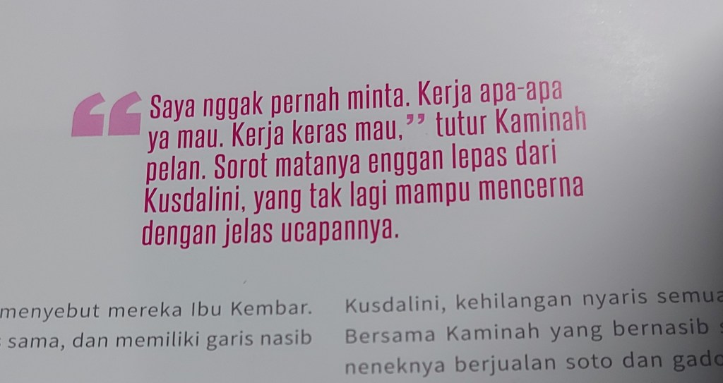Mana rumahnya udah bobrok banget. Sekali sebulan Mbah Kaminah nemenin Mbah Kusdalini berobat pake BPJS karena penyakit tua dan Mbah Kusdalini ada demensia. Something that I can relate to because my mom also has it. It’s tough and it must be tough for Mbah Kaminah as well. Temen hidupnya yang dia kenal dari usia muda, dari masih kuat dan prima, yang sama-sama berjuang untuk bisa survive, menua dengan demensia dan kondisi kesehatan lainnya.